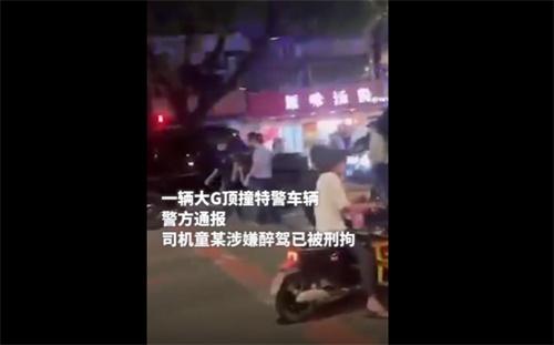 9月27日,廣東惠州一輛大G頂撞特警車輛,警方通報司機童某涉嫌醉駕已經被刑拘,事發前發現車輛停在路口長時間沒有移動,安排特警車輛擋在前面防備他突然啟動。