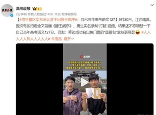 北京時間10月2日,在江西南昌一名男子跟自己的朋友打賭,如果背不出來《滕王閣序》就實名發視頻打臉自己。這名男子表示自己高考語文127分,但沒有想到的是,他真的沒有能夠背的出來《滕王閣序》,而他旁邊的朋友卻是非常輕松自然地將《滕王閣序》整篇背誦了下來,他的朋友也是幸災樂禍的在嘲諷著他,這件事情也是引發了網友們的關注和討論。