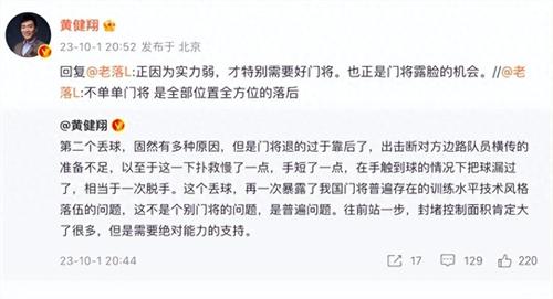 北京時間10月1日,在杭州亞運會的男足1/4比賽當中,中國亞運男子隊伍以0:2輸給了韓國亞運隊伍,而亞運會男足半決賽將會在10月4號進行,在中國亞運男子和韓國亞運男子這場比賽結束之后,黃健翔也是發文對這場比賽進行了解析,他表示本場比賽第二個丟球雖然有非常多的原因,但主要是因為國足的門將退后的位置太多了,所以后衛人員防守不足,才會導致丟球。