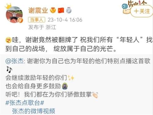 中國田徑隊出色的運動員謝震業在杭州亞運會100米接力賽中獲得冠軍。令人感到驚喜的是,謝震業為自己的隊友點了張杰的《年輕的戰場》,張杰在社交平臺回應謝震業的舉動,聲稱謝謝你為自己,同時為年輕的他們點播這首歌,也會繼續的鼓勵年輕的你們,我們都在為你們驕傲。