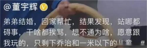 近日,東方甄選帶貨主播董宇輝在自己的社交賬號上發布了一段視頻,視頻講述了自己弟弟結婚回家幫忙的整個過程中發現自己竟然成了礙眼包,不管做什么都會挨罵,不管站在哪兒都特別礙事干啥都挨罵想不通為啥,最后愿意跟我玩的只剩下一米以下的兒童,該帖子也引發了網友的熱議。