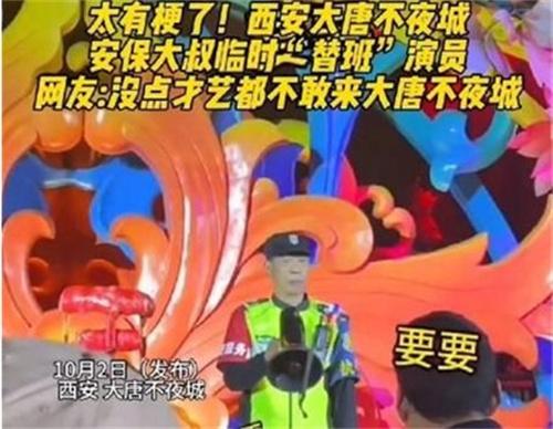 這位保安大叔雖然并不是專業的演員,但是卻非常的擁有表演天賦。今年國慶中秋假期期間,大唐不夜城的游客數量突然激增,為了保證安全景區加大了保安的力量。而這位獨特的保安大叔自告奮勇成為大唐不夜城的臨時演員,使用陜西方言,表演有趣生動的節目,讓現場的游客們捧腹大笑,給大唐不夜城增添了更多歡樂的氛圍。
