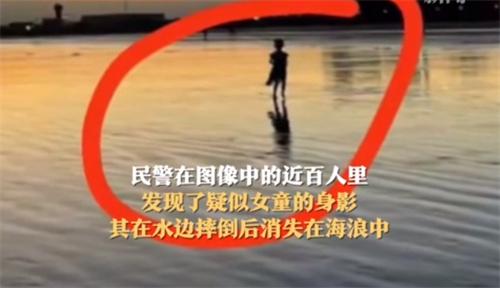 浦東警方同消防救援總隊一起組織了厚天、藍天等六支救援隊大約200人于10月5日再次展開全方位的搜索。組織人員同時逐一排查海昌周圍的20多個監控探頭。初步排查的結果是,這名女孩很有可能被別人帶離了海灘。但是由于周圍探頭的距離比較遠,拍攝到的人的畫面只是一個模糊的白點。指導10月5日傍晚時分才在監控中指出自己和孩子,分開時的準確位置。根據圖像警方在近百個人里終于發現了一個女孩的身影,疑似走失的女童。視頻中顯示女孩在父親離開的地點,等了大約10分鐘之后,走向了水邊,后來在水邊摔倒,然后就消失在了海浪當中。普通警方目前已經協調了上海海事大學和海洋大學的水文專家對水流的走向進行了分析,以便展開進一步的搜尋工作。