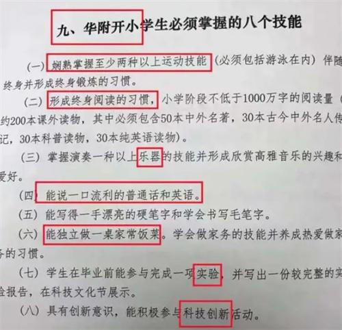 記者通過張先生發布的圖片可以看到必須掌握的8個技能,其中就包括孩子必須熟悉掌握游泳在內的兩項運動。第2點是小學階段孩子必須完成不低于1000萬字的閱讀量,大約是200本左右的課外讀物,其中必須有30本純英語讀物、30本古今中外名人傳記、30本科普讀物、50本中外名著。第3個特色是孩子必須掌握演奏一種或者一種以上的樂器,孩子必須養成對于高雅音樂方面的興趣愛好。第4個技能是每一個孩子都必須說一口流利的普通話和流利的英語。第5個特色是每一個入學的孩子必須有一手漂亮的硬筆字和毛筆字。第6個技能是孩子必須要獨立能夠完成一桌家常飯菜,在家里面學會做家務的技能要養成熱愛做家務的習慣。第7個技能是孩子在畢業之前必須完成一項實驗,根據這份實驗寫出一份比較完整的實驗報告。第8個技能是具有創新意識,孩子在校期間能夠積極參與學校舉辦的科技創新活動。