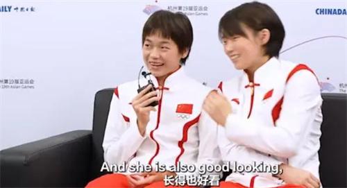 全紅嬋也不甘示弱緊接著開始猛夸陳芋汐,表示陳芋汐的長相非常好看,在訓練中和比賽中有一股不服輸的勁兒特別有魅力。之后陳芋汐就快速回應全紅嬋真的很努力比我還要努力最后二人哈哈大笑。