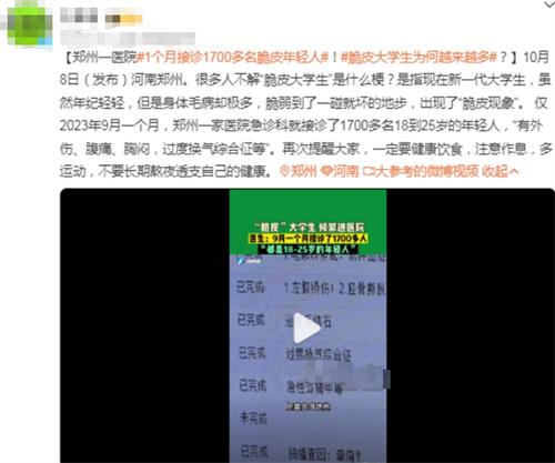 在社交媒體上搜索脆皮大學生這個關鍵詞,可以發現很多讓人感到十分奇怪的意外傷害事件,這些上傳事件信息的大多都是主人公本人,而且在下面的評論區中還有很多同齡人分享自己的脆皮經歷,這種情況讓人感到有些詫異,大學生的體質怎么會這么差。針對這些問題,南京航空航天大學講師朱曉敏做出解釋,目前,大學生的身體素質和健康狀況確實是呈現每年下降的趨勢,出現這種情況與很多因素有關,睡眠,皮膚和情緒方面的因素是主要問題。