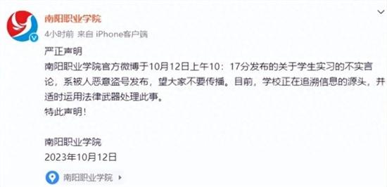 對于這起事件涉事官方微博曾經(jīng)發(fā)布學(xué)生打螺絲的言論之后,聲稱賬號是被惡意盜號發(fā)布,但是這樣的回應(yīng)無法解決問題,反而會讓人們懷疑學(xué)校對實(shí)習(xí)安排的解釋與誠意。教育部對學(xué)生實(shí)習(xí)安排有明確的規(guī)定,學(xué)生在二年級開始需要進(jìn)行6個月的實(shí)習(xí),而且實(shí)習(xí)崗位需要和學(xué)生專業(yè)相近或者是一致對于學(xué)生反饋的問題。南陽教育局表示會聯(lián)系該學(xué)校調(diào)查此次事件,我們可以拭目以待這件事情的調(diào)查結(jié)果。