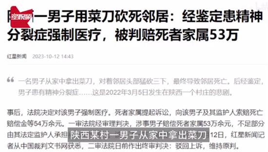 2022年3月5日,陜西西咸新區(qū)一名男子從家中拿出菜刀對鄰居的頭部猛砍三下將鄰居砍死,后續(xù)經(jīng)醫(yī)療機(jī)構(gòu)鑒定。該男子患有精神分裂癥,這起事件發(fā)生后,法院判決該男子接受強(qiáng)制醫(yī)療,死者家屬向法院提起訴訟,要求男子和監(jiān)護(hù)人賠償死者及家屬54萬余元。經(jīng)過一審法院的審理判決,涉事男子需賠償死者家屬53萬余元,不足的部分會由法定監(jiān)護(hù)人承擔(dān)額外的賠償責(zé)任。一審法院宣判后該男子不服提起上訴,二審法院于近日對這起案件作出終審判決,駁回該男子的上訴請求,維持一審原判。
