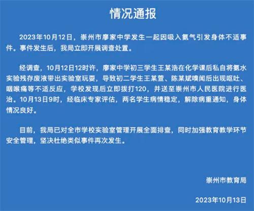 10月13日,崇州市教育局的一位負責人回應此事,表示教育局的工作人員已經前往學校進行調查,對于氨氣事件會盡快查明事情原因和經過。同時,廖家中學一位副校長在接受記者采訪時表示,我們的學生并沒有出現氨氣中毒,后續記者繼續詢問時,該副校長并沒有透露更多的細節。