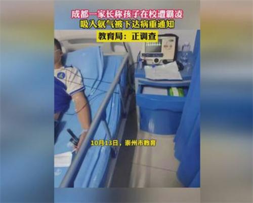 近日,四川成都崇州市廖家中學發生了一起校園霸凌事件,一名初二的學生王某在該校被另一名高年級學生要求吸入氨氣,導致氨氣中毒當場昏厥。隨后被送往醫院接受緊急救治,事后王某家長向記者介紹稱,自己的孩子是10月12日受到高年級同學的霸凌行為,孩子被迫吸入氨氣后立刻就出現了嘔吐和暈厥的癥狀,經過醫生診斷自己孩子的病情是氨氣中毒和支氣管炎。