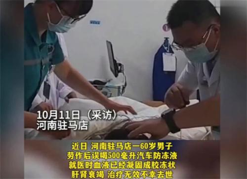 近日,河南駐馬店有一位60歲的男子誤喝500毫升的汽車防凍液,導致血液凝結成膠凍狀離世。這位60歲男子本來在田野上辛勤的勞動,卻因為一場失誤導致付出了性命的代價,他誤飲汽車防凍液后一直持續到11個小時之后才開始尋求醫療救援。但是這個時候已經為時已晚,他的身體受到了無法彌補的傷害,這位男子走進醫院的時候,醫生經過檢查告訴他,你的血液里現在已經向凝固的膠凍一樣,這是防凍液的化學成分和人體血液產生的化學反應,這種凝固現象阻斷了血液循環,讓身體器官無法獲得氧氣,甚至會引發器官衰竭。