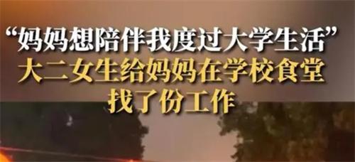 最近陜西師范大學的一名大二女生徐同學登上了熱搜。據了解她的媽媽為了能陪伴女兒上大學,成為學校里的食堂阿姨,在這里主要負責備菜、煮菜和打掃衛生。當事人徐同學介紹,媽媽之前是在老家的村子里面打零工,后來因為自己上大學,媽媽想要陪伴自己,她就在大學食堂里給媽媽找了一份工作。媽媽是在十一假期之后,來到飯堂開始上班的,而徐同學現在每天也都能見到媽媽,晚上能和媽媽一起吃飯或者散步,感覺每天都很幸福。