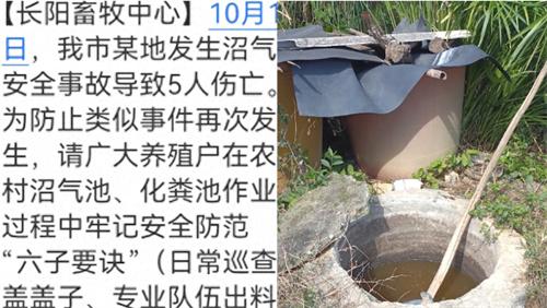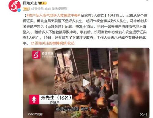 10月19日消息,網傳湖北宜昌發生了一起沼氣安全事故,該事故導致五人死亡。據了解,有網友在網上發文,聲稱自己收到了長陽畜牧中心發來的短信。網友給出的截圖中顯示,10月15日,我市某地發生沼氣安全事故導致五人傷亡。10月19日記者聯系當地相關機構得悉,網傳的沼氣安全事故導致五人傷亡事件是發生在湖北省宜昌市夷陵區下堡坪。