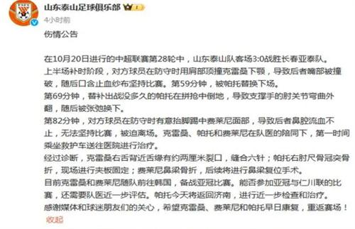 10月21日,山東泰山足球俱樂部發(fā)布了傷情公告,山東泰山隊(duì)在中超聯(lián)賽第28輪的比賽中客場對(duì)戰(zhàn)長春亞泰隊(duì),這一場比賽上半場補(bǔ)時(shí)階段,對(duì)方球員在防守的時(shí)候用肩部頂撞克雷桑的下顎,導(dǎo)致克雷湯的嘴部被撞破,后期比賽的時(shí)候一直嘴含紗布堅(jiān)持比賽,第69分鐘的時(shí)候剛剛替補(bǔ)出戰(zhàn)沒多久,帕托在搶球的時(shí)候倒地,導(dǎo)致支撐身體的肘關(guān)節(jié)彎曲外翻,第82分鐘的時(shí)候,費(fèi)萊尼在進(jìn)攻的時(shí)候被對(duì)方防守球員抬腳踢中面部,導(dǎo)致鼻腔處流血不止被迫離場。