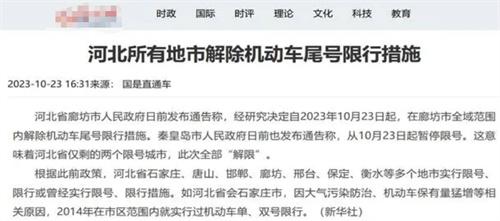 10月23日媒體報道,河北廊坊人民政府在近日發(fā)布通告稱,經(jīng)過研究決定,從2023年10月23日開始,于廊坊市全區(qū)域內(nèi)解除機動車尾號限行的措施。隨后秦皇島市人民政府發(fā)布通告稱,從10月23日開始暫停機動車尾號限行。此次這兩個城市發(fā)布通告解除機動車尾號限行,河北省僅剩的兩個限號城市,此次已經(jīng)全部解限。