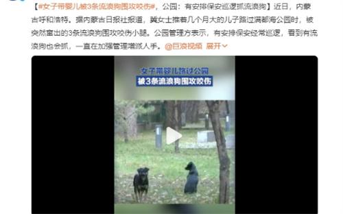 內蒙古呼和浩特的一位冀女士近日推著自己幾個月大的兒子在滿都海公園散步時被三只流浪狗圍攻,冀女士的小腿被流浪狗咬傷。公園的管理方表示公園一直都有保安巡邏,看到流浪狗會抓捕,日后會加強人手的增派。此事引發社會各界人士的廣泛熱議和關注。