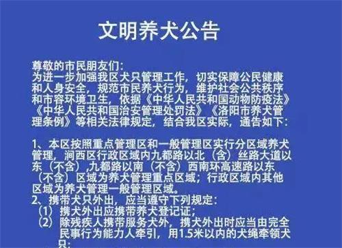 10月20日,洛陽(yáng)發(fā)布一則規(guī)定,內(nèi)容是《澗西區(qū)劃定養(yǎng)犬管理區(qū)域》,并且指出攜帶犬只出戶的時(shí)間是每天的20:00至次日7:00。洛陽(yáng)市的這一規(guī)定是因?yàn)榻谟腥还羧藢?dǎo)致嚴(yán)重受傷,并且詳細(xì)制定了文明養(yǎng)犬公告。養(yǎng)犬人士必須規(guī)范自家犬只的行為,市民也不要輕易的靠近犬只避免發(fā)生被咬傷的事件。