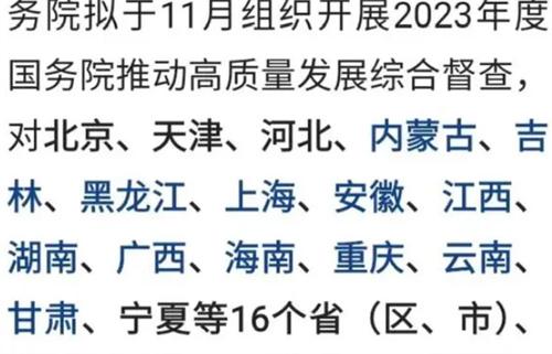 北京時間10月23日,國務院辦公廳最新發布了關于2023年度國務院推動高質量發展綜合督查征集問題線索的公告,全文如下。根據公告內容顯示國務院為了推動各地區各部門在工作中認真貫徹落實黨中央關于提出高質量發展決策部署準確,全面貫徹新發展理念以及促進經濟實現質的有效提升以及量的合理增長,國務院擬定于11月組織開展2023年度國務院推動高質量發展綜合調查將對北京、天津、河北、內蒙古、吉林、黑龍江、上海、安徽、江西、湖南、廣西、海南、重慶、云南、甘肅、寧夏等16個省市,國務院將會組織相關部門進行實地督查。