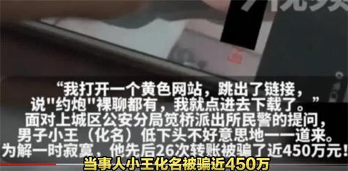 杭州一名男子小王由于晚上寂寞受到了美女照片的誘惑,進(jìn)入了一個黃色網(wǎng)站。隨后進(jìn)入了騙子的圈套,被拉入了一個博彩群,前前后后轉(zhuǎn)賬多達(dá)26次,被騙金額達(dá)到人民幣450萬,直到民警找上門小王才意識到被騙,該案件目前已經(jīng)被偵破。