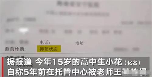 女兒遇到這種行為讓這位家長感到十分憤怒,女孩由于害怕一直沒有向父母講起這件事,直到最近才向父母坦白了這件事情。據(jù)了解,當事女孩今年已經(jīng)15歲了,她是在五年前被一個托管中心的男教師性侵,2018年的時候,女孩的家里由于拆遷導致新家距離學校較遠。于是女孩的母親便把她送到朋友開的托管中心托管,按照托管中心的約定,周一到周五女孩在托管中心里用餐,周末則由家長帶回到家里過周末。