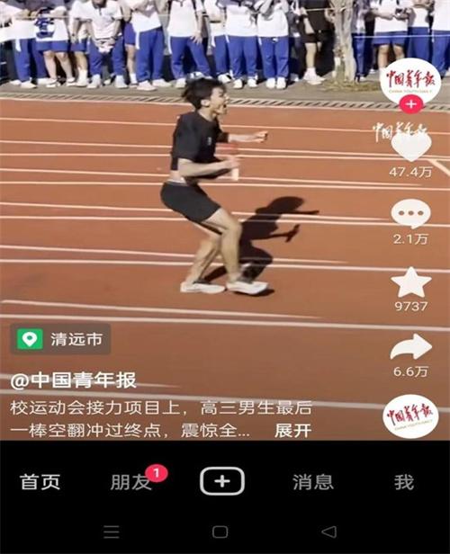 北京時間10月27日,在廣東清遠的一所學校展開了一場運動會,而在這場運動會當中的4x100m的接力比賽發生了一件十分有人心的事情,作為這一場接力賽的最后一棒,一名高三男生他已經是勝券在握了,最后他決定用一種與眾不同的方式進入終點,于是他在快到終點的時候,直接選擇使用后空翻翻進了終點,現場大部分的學生們都是為他鼓起了掌聲。