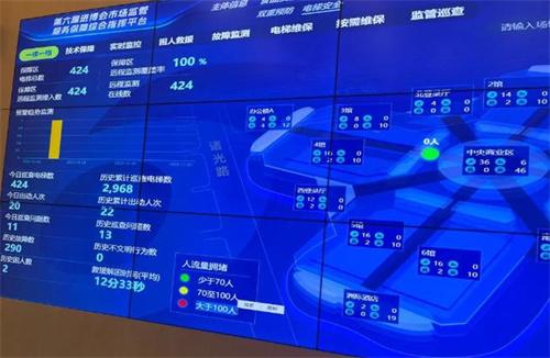 國家會展中心紅線范圍內(nèi)有432臺電梯,但其中有210臺是自動扶梯。由于自動扶梯,很有可能會發(fā)生客流量大的情形,特地設(shè)置了預(yù)警監(jiān)測系統(tǒng),根據(jù)電梯點(diǎn)位裝置上的攝像頭,采取先進(jìn)的算法。對扶梯點(diǎn)位承載的人數(shù)和不同量級的人流量擁堵情況進(jìn)行實時監(jiān)測。系統(tǒng)進(jìn)行了預(yù)設(shè),擁堵人流如果達(dá)到50人,就會出現(xiàn)綠色告警。擁堵人流,如果達(dá)到70人,則會出現(xiàn)橙色告警,印度的人流量達(dá)到100人,則會顯示紅色告警。