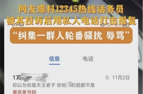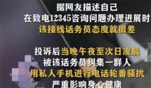 有媒體報道,根據(jù)陜西咸陽市網(wǎng)友反饋12315市民熱線話務員被投訴后疑似對方集多人用私人電話辱罵。有知情人士對記者表示的確有這件事情,已經(jīng)接到上級單位的反饋,涉事的話務員正在接受調(diào)查,咸陽市委網(wǎng)信辦的工作人員表示關注了這件事情正在處理中。據(jù)這位網(wǎng)友表示自己在致電12345市民熱線咨詢問題辦理進展的時候,借錢的話務員態(tài)度特別差,之后就將這位話務員投訴,這名網(wǎng)友稱投訴當天晚上,話務員使用多個私人手機進行輪番的騷擾辱罵。