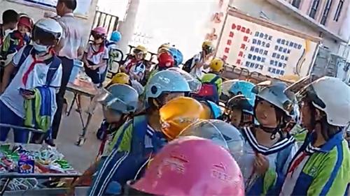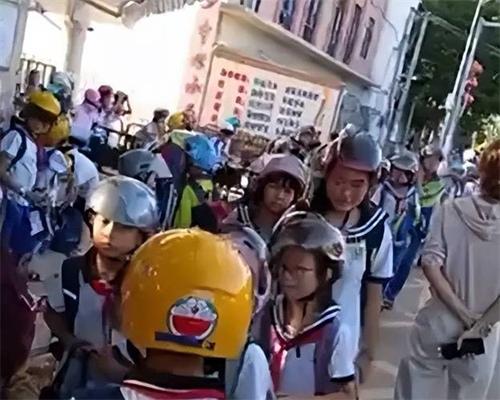 通過網上所傳的視頻和照片可以看出。在角尾鄉中心小學校門口,學生們陸陸續續的走進走出校門都戴著頭盔。視頻中有幾十名學生在走路時都戴著頭盔,只有一名學生沒帶頭盔,但是頭盔拿在手上,但是視頻中卻并沒有看到自行車摩托車或者是電動車出現。