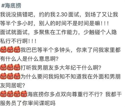 近日,有網友在社交平臺發布文章稱自己在參加海底撈線下面試的時候被對方問及到自己的男朋友年齡有多大,家里人是否知道自己和男朋友同居等一系列隱私問題,也讓這名網友質疑海底撈在面試的時候不尊重求職者。針對網友的發帖海底撈的工作人員有回復,根據他們和相關面試的門店核實了解到的情況和張女士在網上的說法有著很大的出入。面試的過程中肯定會對求職者的信息進行了解,但是在面試的過程中海底撈一直秉承著尊重應聘者個人隱私的態度。
