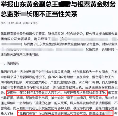 11月8日消息,一則關于山東黃金集團有限公司副總經理王某和公司派駐其他公司的財務總監張某的實名舉報引起人們的關注。舉報人指責王某和自己妻子張某長期保持不正當的男女關系,還涉及權色交易等違法違紀的行為,這一舉報在網上曝光后引發了社會的熱議。根據舉報人發布的長文來看,自從2011年開始,王某和張某就存在這種不正當的性關系,2021年甚至還感染了HPV 16+,這兩人既是公司里的上下級也是私底下的情人關系。