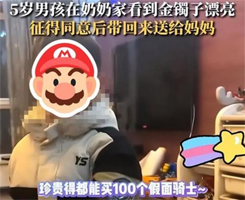 當小男孩看到自己的媽媽時,他讓自己的媽媽把眼睛給閉上,于是他就悄悄的將金鐲子給拿了出來,隨后他就叫自己的媽媽把眼睛睜開,媽媽看到這個金鐲子的時候便直呼好漂亮,還詢問小男孩是從哪里找到的這個金鐲子,而小男孩也告知自己的媽媽,這是奶奶把金鐲子給了他,而且小男孩還告訴媽媽,這個金鐲子非常珍貴,能夠換取100多個假面騎士的面具。這件事情也讓小男孩的媽媽非常感動,小男孩的媽媽表示自己的孩子非常有孝心,經常看到有一些好東西都會想著拿回來給自己。