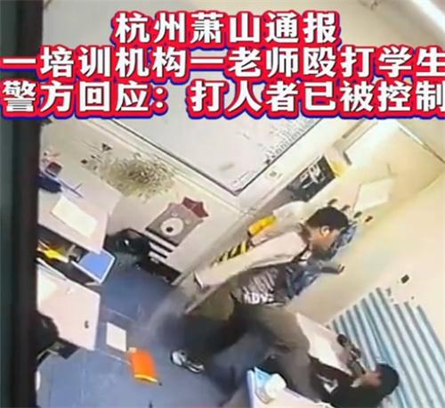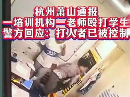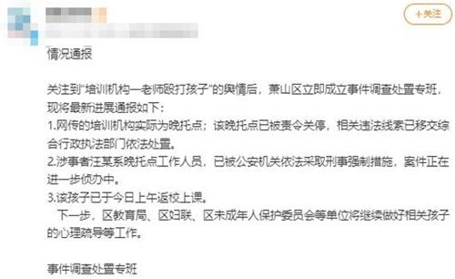 根據視頻顯示在某一個教室內站在講臺邊的一個男老師先是用手中的書猛砸一個坐在第1排的男生,之后又走上前去不斷敲打該男生的頭部,用腳踹這名男生的腹部,最后還將這名男生抱摔在地上。11月10號@蕭山發布微博針對該事件再次作出通報內容如下,關注到某培訓機構的一名老師毆打孩子的網絡輿情,之后蕭山區立即針對該事件成立了專項調查組,也將事件最新的進展通報如下:第一網絡上所傳言的培訓機構實際上是晚托班,該晚托班在發生毆打事件之后,已經被相關部門責令關停。該晚托班相關違法的線索目前已經移交到了綜合行政執法部門依法處置。