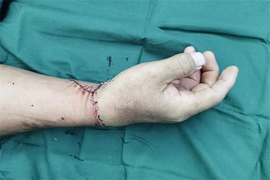 小李在醫院進行簡單處理之后,醫生建議他轉到專科醫院,當天8時左右小李被轉移到四川省骨科醫院急診科,這里的值班醫生查看傷情之后立即聯系上級醫生及手術室安排手術,醫務人員還用生理鹽水為小李消毒。四川省骨科醫院手腕科副主任程亞博解釋說,這類離斷傷在傷后6到8小時內進行再植手術條件最佳,否則會影響斷肢存活率。10月29日晚11時手術開始,手術的難點在于需要修復的組織多,所有離斷的骨質、肌腱、血管、神經都需要重建,而且血管比較細,需要用到的縫合線甚至比頭發絲還要細,不得不在顯微鏡下進行修復,再加上又是晚上的急診,也對外科醫生的能力是一種艱巨的考驗。在長達7個半消失的努力下,小李的斷肢再植手術順利完成,不過因為床上比較大,小李出現了失血性貧血,術后被轉到ICU監護治療,小李的右手成功保住。