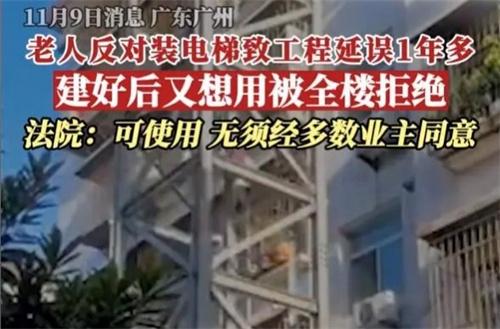 廣州某小區業主建議加裝電梯,但是老人反對安裝,卻在建好之后想要使用,這引起了其他業主的反對。事件發生時間是2017年至2018年,廣東廣州荔灣區某小區某棟9層住宅樓業主建議加裝電梯,其中44戶業主有32戶同意,但居住在3樓年近8旬的郭某因為有意義,所以沒有參與出資,當電梯使用之后郭某希望在補交相應集資款之后使用該電梯,但是其他的業主反對郭某使用電梯。