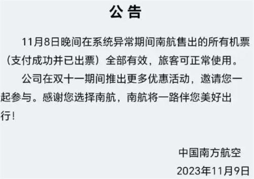 多名消費者在11月8日晚間反映多條南航從成都進出港的航線機票價格低到了30元以下,分別是10~30元不等。南方客服就此事進行回應稱,出現(xiàn)超低價的機票的原因是系統(tǒng)故障。南航于11月9日,發(fā)布公告稱所有在11月8日系統(tǒng)故障期間低價出售的機票全部有效。此公告既回應了社會所關注的問題,同時,引起了社會的廣泛質疑和討論。