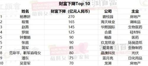 從榜單上的名次可以看到2022年的中國女首富碧桂園的楊惠妍進(jìn)入2023年之后財(cái)富縮水最多達(dá)到270億元,憑借490億元的財(cái)富位列第5名。其次是受到了添加劑事件影響導(dǎo)致公司業(yè)績下滑的海天味業(yè)的程雪,財(cái)富相比2022年縮水了165億元,號(hào)稱玻尿酸女王的華熙國際的趙燕進(jìn)入2023年之后財(cái)富縮水了145億元。