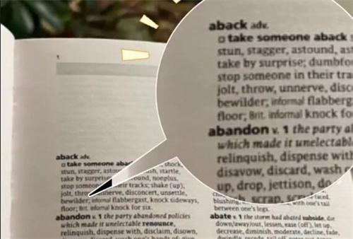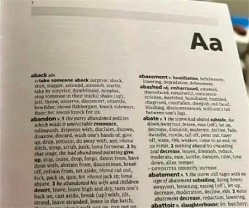 最近關于“abandon”這個單詞在《牛津平裝本同義詞庫》中不是第1個單詞,引起了網友們的關注。這個消息傳出之后,在社交媒體中引發了騷動,有一部分人對此感到特別驚訝,不過也有一部分人表現的很淡定。根據網友透露最新版的《牛津瓶裝本同義詞庫》中abandon這個單詞不是第1位,而是第2位,“aback”這個單詞則成為第1位。有些人在這個看似微小的變化中看出了詞庫編輯們的用心,因為這部分人認為“aback”這個單詞作為第1個單詞,能夠體現出英語詞匯的豐富性和多樣性。
