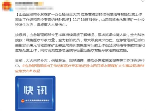 11月16日消息,今日上午7時左右,山西省呂梁市永聚煤礦一處辦公樓發生了火災。此次火災造成重大人員傷亡,當地消防救援部門接到報警電話后迅速下發指示,要求盡快核心人數,權力科學的展開搜救活動,要積極調集醫療專家力量,全力營救此次事件的傷員。在最大限度內減少事件的傷亡程度,應急管理部目前已經派出工作組前往現場進行指導,同時,還調派了應急總醫院的醫療專家組前往支援。截止到目前,大火已經被撲滅,傷員救治和現場清理等工作仍舊在進行。