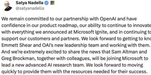 11月19號,微軟首席執行官納德拉在社交賬號中發文稱OpenAI創始人山姆·奧特曼和格雷格.布洛克曼即將加入到微軟主持一個新的高級AI研究團隊。在文章中納德拉還稱山姆.奧特曼將會和格雷格.布洛克曼及一眾同事加入的微軟。而Emmett Shear將會接替山姆.奧特曼擔任OpenAI公司CEO一職。