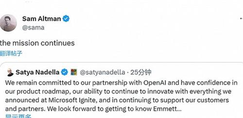 納德拉的文章發布之后山姆.奧特曼就轉發了該則消息同時發文稱任務將會繼續。