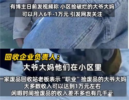 根據(jù)媒體最新報(bào)道日前有博主在網(wǎng)上發(fā)布視頻稱生活中隨處可見的撿破爛的大爺大媽,她們的月收入可以達(dá)到6000到1萬元。根據(jù)博主所發(fā)布的視頻中某回收企業(yè)的負(fù)責(zé)人表示,生活中隨處可見將撿廢品當(dāng)職業(yè)的大爺大媽們,大多數(shù)的收入都可以達(dá)到1萬元左右,如果是利用自己閑暇的時(shí)間減廢品大爺大媽們的收入可以達(dá)到幾千元。這個(gè)廢品回收公司的負(fù)責(zé)人表示,他們撿的破爛是全品類的,比如紙箱子、紙、PET塑料瓶、亞克力、餐盒等等。紙箱一公斤是1塊2,餐盒一公斤是4塊錢左右,所有的廢品價(jià)格都是浮動(dòng)。