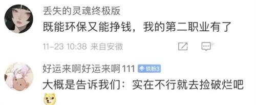 該視頻發(fā)布之后徹底在網(wǎng)上引起熱烈討論。有些網(wǎng)友開玩笑說要加入到大爺大媽的隊(duì)伍,既能夠環(huán)保還能夠掙到比自己工作多的錢我的第二職業(yè)有,另外,有一些網(wǎng)友表示,這個(gè)視頻大概是在告訴我們工作實(shí)在不行的話就去撿破爛。但是有一些網(wǎng)友表示,太難了小區(qū)的競(jìng)爭對(duì)手太多,我們小區(qū)阿姨都在搶紙箱。其次,有網(wǎng)友表示,撿破爛的大戰(zhàn)一觸即發(fā)晚一分鐘這個(gè)紙箱就沒了,我雙11期間總共拆了二十幾個(gè)箱子,當(dāng)我把他們?nèi)咳舆M(jìn)垃圾桶的時(shí)候,我知道可能會(huì)有一場(chǎng)搶紙箱的大戰(zhàn)就要發(fā)生。