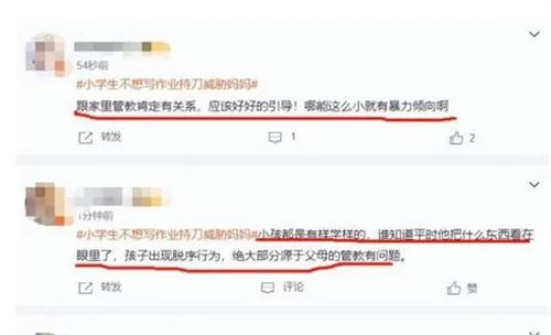 另外,有一些網友表示,這個小學生之所以會變成如今的模樣,有可能與家長日常的教育離不開關系。看這位母親的態度就知道,他對孩子的教育恐怕是不上心,或許是過分寵溺孩子,把自己的孩子給慣壞,不然的話,一般小學生有誰敢用刀來威脅自己的父母。而且這個孩子都已經如此叛逆,這位母親究竟有沒有反思自己的教育方式。