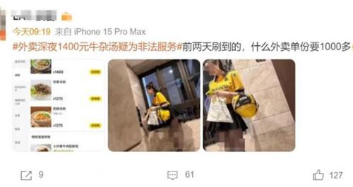 11月初,該賬號拍攝了多個女性身著外賣工服身穿絲襪短裙的擦邊視頻和照片,這些照片在自媒體平臺上瘋狂傳播,也被一些博主解讀為新型賣淫模式。另外,還有人將海外某訂餐平臺的高價菜單頁面,與該網紅擺拍的黃色擦邊照片拼接在一起,通過網絡社交平臺的方式進行傳播,該消息被關注之后一度登上微博的熱搜。