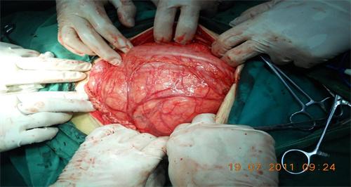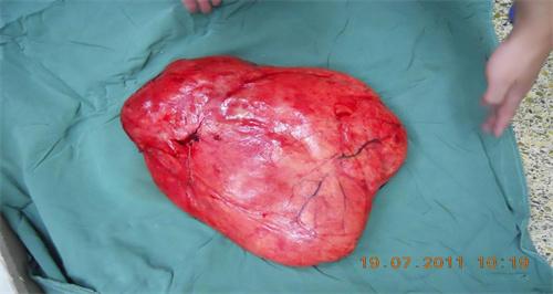 據了解,35歲的王柳一直以來在全國各地打工,認為自己的身體非常的健康,然去年5月份腹部有些脹疼,摸到明顯的腫塊,當時忙著照顧孩子,一直沒有去醫院,兩個月之后明顯腫塊擴大,前往附近的醫院就診,被告訴是脂肪瘤,需要進行減肥,之后減輕體重,然腫塊越來越大,今年10月下旬來到西南醫院就診室,腫塊已經使腹部高高隆起,就像快臨盆的孕婦,入院的時候整個人非常的瘦,與肚子形成鮮明的對比。根據檢查結果顯示,腹部的腫瘤長大約40厘米,占據腹腔的3/4的空間。有一定的手術難度。