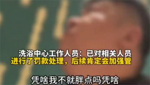 11月27日,遼寧沈陽(yáng)一名男子發(fā)布視頻稱,自己在洗浴搓澡時(shí)竟然被技師歧視取笑,視頻中男子表示,自己雖然胖,但是沒有影響到任何人,如果洗浴中心不愿意給身材超重的客人搓澡,那么自己也可以不來(lái),為什么要這樣的羞辱自己,針對(duì)這名男子的質(zhì)疑,該洗浴中心的工作人員稱,這起事件經(jīng)過經(jīng)理處理后已經(jīng)解決。顧客離開后是比較滿意的,目前已經(jīng)對(duì)相關(guān)人員進(jìn)行了罰款處理,后續(xù)會(huì)對(duì)員工加強(qiáng)管理。