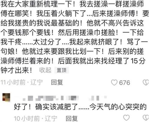 這件事情在網(wǎng)上曝光后也引起了很多網(wǎng)友的質(zhì)疑,有網(wǎng)友評(píng)論稱,此前曾經(jīng)遇到過搓澡師傅開玩笑說(shuō),小伙你這么胖要加錢啊,結(jié)果小伙直接懟了一句,如果我是瘦的,你是不是還要打下折,這句話說(shuō)完過后搓澡師傅瞬間不吭聲了。還有網(wǎng)友表示,胖是可以減肥的,但是有些人內(nèi)心缺德卻是救不了的,搓澡是一項(xiàng)服務(wù),給別人提供服務(wù)還笑話別人胖真是無(wú)法理解。