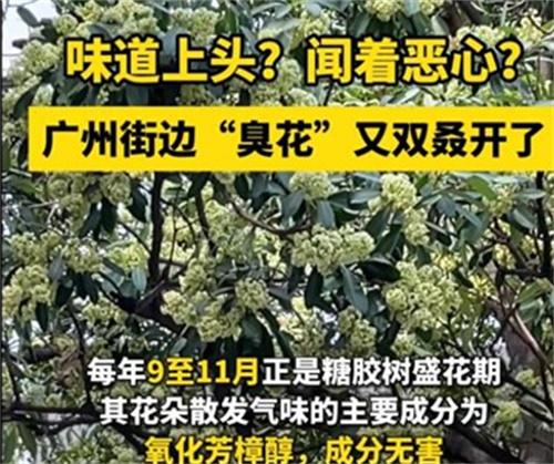 這些有刺鼻難聞氣味的叫做糖膠樹,每年10月左右糖膠樹會開花,這個季節(jié)正值廣州秋天糖膠樹枝頭會有很多黃色的小花,不好聞的氣味正是從這些花朵當(dāng)中散發(fā)出去。不少網(wǎng)友表示,晚上散步的時候,這些花散發(fā)的氣味讓人熏得頭疼,回家的時候,整個鼻腔充斥著臭味。