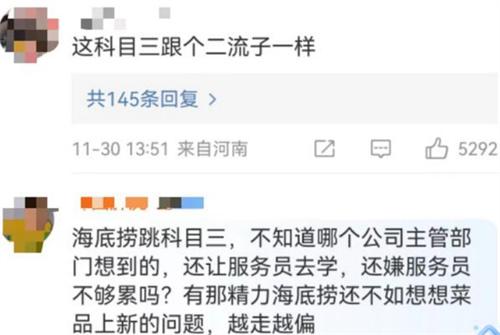 在這各舞蹈在網上爆火之后,海底撈有很多門店也紛紛要求門店內的員工必須要學會這些舞蹈,專門在消費者進店消費的時候,可以讓消費者去進行點播,但海底撈的這一做法,卻引發了社會各界的多方質疑。有很多網友在看到這些舞蹈種類之后,紛紛表示,這些舞蹈種類實在是太過低俗。另外,有很多網友則直接表示這些舞蹈實在是太過吵鬧,希望海底撈可以去進行調整。