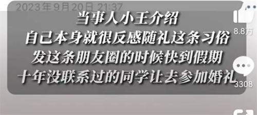 當事人小王表示現(xiàn)在馬上就到假期了,自己再發(fā)這條朋友圈之前有一個10年都沒有聯(lián)系過,今年才加上聯(lián)系方式的初中同學邀請我去參加婚禮,就覺得之后還會出現(xiàn)這種情況且自己是非常反感隨禮金這條習俗,就直接在朋友圈里面說清楚避免再出現(xiàn)類似情況。